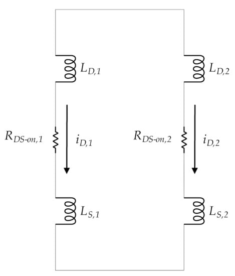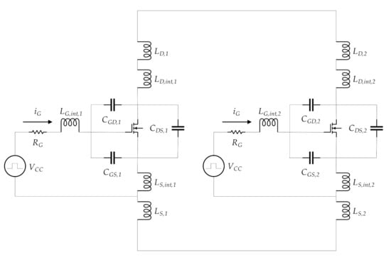 where VCC is the gate driver high-level output; Vth, gm, and Ciss are the threshold voltage, the transconductance, and the input capacitance of the device, respectively; iD is the drain current; LS is the source inductance common to both gate and power loop; and RG is the gate driver resistance. Based on (2), it is concluded that the slew rate of drain current depends on several factors and any mismatch of these factors between devices will also result in dynamic current unbalance. As for the turn-off transition, Equations (1) and (2) can be written in a similar way. In conclusion, Equations (1) and (2) indicate that td and diD/dt depend on the magnitude of RG [16].