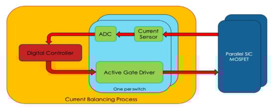 In a few studies [5,15,16], an active current balancing method uses current sensors with the purpose of sensing the dynamic current unbalance directly and actively. In the process, a current balancing controller receives the unbalance and generates the proper corrections which should be implemented to the gate of one of the parallel devices. Finally, an active gate driver synchronizes the switching trajectories of the parallel power devices, based on the instructions of the controller. In this way, dynamic current unbalance is eliminated in a closed-loop and independently of the cause. In [5], the turn-on current unbalance was eliminated, and in [15,16], dynamic current balance was achieved.