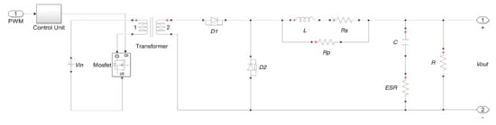 Nonetheless, design of forward converter is also crucial for the output voltage ripple of the converter and especially for the VGS which affects SiC MOSFET driving process. Figure 6 shows the forward converter topology that is used for the construction of the proposed gate driver, along with the parasitic elements of the LC filter. RS and ESR are the equivalent series resistances of the inductor and the capacitor, respectively, and Rp represents the parallel resistance, which is correlated with the parallel leakage path, associated with the inductor. Based on (13), output inductor current ripple (ΔILX) can be reduced by increasing switching frequency, reducing the neediness for a larger LC filter. However, (12) states that increasing fsw, results in Vvar,step increase. In addition, (13) states that inductor (L) selection influences ΔILX, and (14) supports the idea that capacitor (C) magnitude affects output voltage ripple (ΔVout). Therefore, ΔVout can also be reduced by the proper selection of LC values. For selecting LC magnitude, it should be considered, that the larger the inductor magnitude is, the larger its parasitic resistors are, resulting in a voltage drop in the converter output voltage. Another essential factor that affects unbalance mitigation is the transient response time which significantly depends on capacitor magnitude. Therefore, converter transient response time can be reduced by using a smaller capacitor, making the forward converter respond faster to duty cycle (D) variations and vary output voltage (Vout) in less time. In conclusion, the proper forward converter design is a trade-off between switching frequency and LC filter selection with the purpose of producing an output voltage with the least ripple, combining the ability to vary the output voltage in quite short period of time (μseconds). In addition, resistance (R) should be as great as possible for reducing output current and power consumption, considering that R selection also affects the transient response time of the converter.
