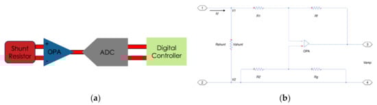 Schematic of: (a) current sensing system; and (b) shunt resistor and differential amplifier.