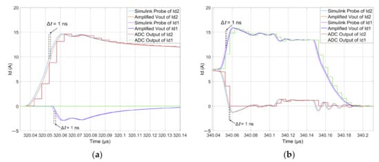 In addition, two different time delays are included. One is the propagation delay of each OPA, which is equal to 1 ns, as indicated by the LT1818 high-speed operational amplifier datasheet [36]. The other one is the sampling delay of each ADC, which is set to 2.6 ns, as also indicated by the ADC08200 Analog-to-Digital Converter datasheet [37]. According to Figure 8, there is a time difference (Δt) between the current signal of each Simulink probe (light blue and purple) and its amplified Vamp signal (orange and blue). This time difference is attributed to the propagation delay of each operational amplifier. However, the currents measured by the Simulink probes and the amplified Vamp signals are at the same level during the time duration. Therefore, the sensing process with the usage of current sensing resistors is accurate. The only measurement error derives from the sampling capacity of each ADC and its resolution (brown and green).