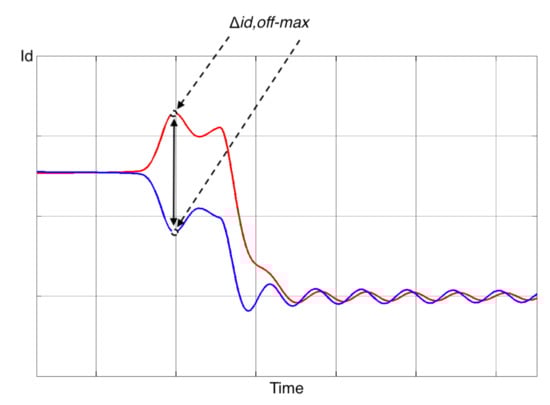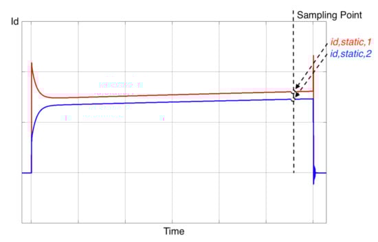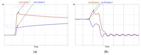 The digital controller samples the parallel currents at the proper time point/areas of the period during the three current states. For the estimation of the static current unbalance, the current sampling system samples the parallel currents during steady-state at a specific time point (id,static), as shown in Figure 10. As for the dynamic current unbalance measurement, the sampling system can detect the peaks of parallel currents during turn-on and turn-off transients (id,on-peak and id,off-peak, respectively), around the proper time areas of the period, as shown in Figure 11.