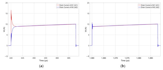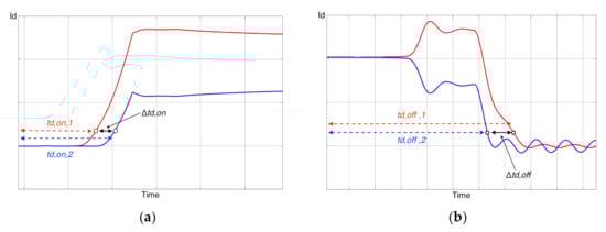 As mentioned above, dynamic current unbalance may occur due to parameter mismatch of devices and deviation between parasitic elements of the power circuit. According to (1), turn-on delay (td(on)) depends on device parameters. As a result, during turn-on transition, td(on) mismatch, deriving from device parameter deviation, will lead to dynamic current unbalance [16].