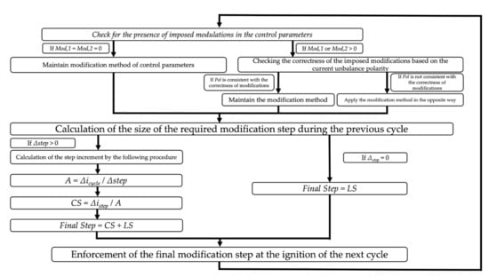 In the next stage, the controller begins to apply the necessary corrections to the control parameters of the appropriate SiC MOSFET, suppressing the three types of unbalances in a specific order, and not simultaneously, as shown in Figure 14. If the static current unbalance is greater than a specific limit (e.g., 0.1 A), the controller only starts to increase the VCC of the power switch that carries the least current during steady-state, suppressing static current unbalance and affecting dynamic current sharing. If VCC increases to a certain point and static current unbalance still exists, the controller ceases to increase VCC and starts to decrease the VCC of the power switch that carries the greatest current during steady-state.