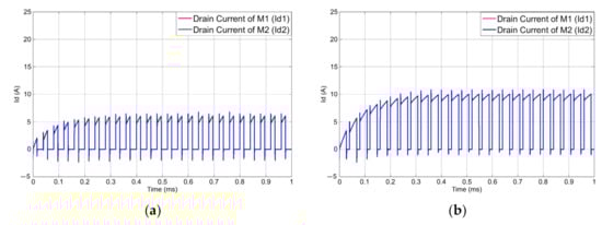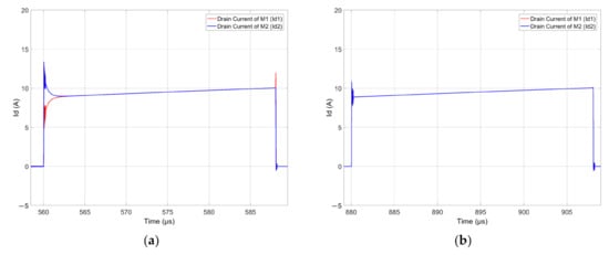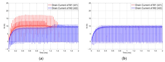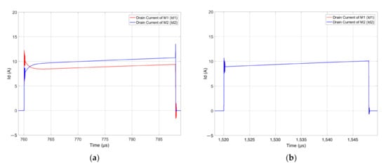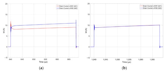 As mentioned above, the digital controller can store a combination of modifications in case the three unbalances are kept at a low level. In addition, the controller applies the stored modifications during the beginning of the application. Once the operating process has been entered in steady-state, the current balancing process is initiated. In order to exam the efficiency of the storing ability, another two simulations are performed, when the technical parameters of the power switches are selected as follows: RDS-on,M1 = 80 mΩ, Vth,M1 = 2 V, RDS-on,M2 = 98 mΩ and Vth,M2 = 4 V. In this simulation test, a comparison between the initial starting and a next one is conducted with the purpose of illustrating the magnitude of the current unbalance without and with the application of a stored combination of modifications during the beginning of the operating process. Figure 29a illustrates the current sharing between parallel SiC MOSFETs in case the controller does not apply any stored combination at the beginning of the operating process. As shown in Figure 29b, the controller applies a stored combination of modifications from the beginning of the simulation. In Figure 29b, it is observed that the implementation of the stored modifications at the ignition of the application leads to a well-balanced current distribution even from the first operating cycles, illustrating the effectiveness of the controller storing capability. Additionally, the level of the overall unbalance is very low, resulting in low variation of conduction and switching losses even from the first operating cycles.