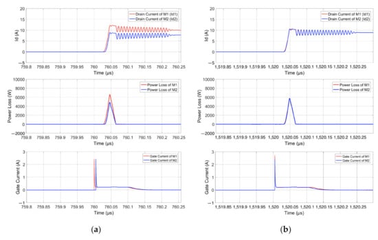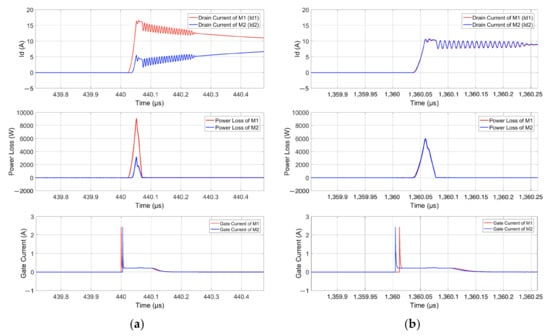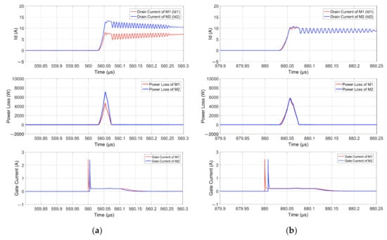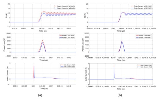 Turn-on waveforms, power loss and gate currents, when ΔVth = 2 V: (a) without; and (b) with the proposed method.