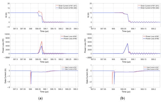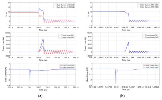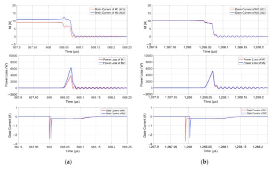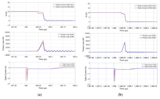 Turn-off waveforms, power loss and gate currents, when ΔRDS-on = 18 mΩ: (a) without; and (b) with the proposed method.