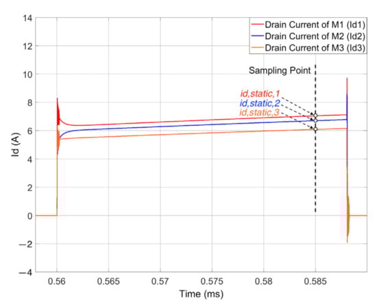 Current sampling points during steady-state for three parallel-connected SiC MOSFETs.