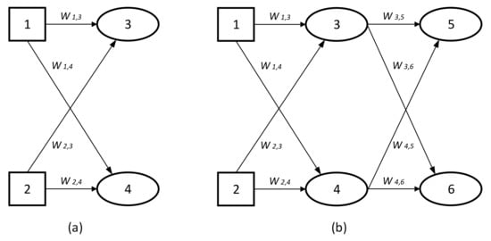 (a) Simple neural network with two input nodes and two output nodes. (b) Simple neural network with two input nodes, one hidden layer with two nodes and two output nodes.