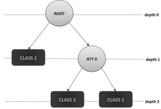 Figure 2, adapted from [38], depicts an example of a general DT for classification. The circles denote the root and internal nodes while the square denote the leaf nodes. In this particular example, the DT is designed for classification, and thus, the leaf nodes hold class labels.