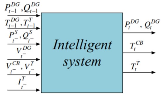 In this study, an ISs-based methodology is presented, which allows one to define the real-time centralized control of voltage magnitude and reactive power of an electrical distribution system, using electrical measurements as an input database. These data are submitted to a filtering process to later enter the intelligent system. The classification process is carried out within the ISs. Finally, the most appropriate adjustments of modules in operation of CBs, the number of tap steps of each OLTC transformer, and the active and reactive power injections from each DG unit are obtained. Figure 4 shows a diagram with the respective input and output variables of the IS.