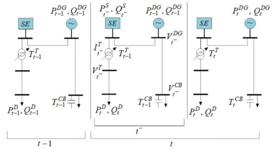 Figure 5 shows a graphical representation of the steps required to create the database used to perform ISs training. At time period , the system is operating on a steady state with active and reactive demands given by and , respectively, and with values of control variables given by , , , and . Note that between time and t, there is a time labeled as ; this time is before the system control changes; that is, the controls defined in the time period remain fixed on while the demand varies. Given the controls defined in the fixed time period and the variation of demand (, ), a new operating point is defined in the system in time . This operating point can be calculated using a backward/forward sweep load flow [44].