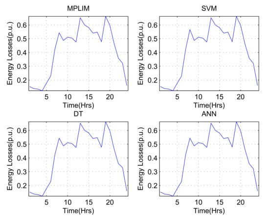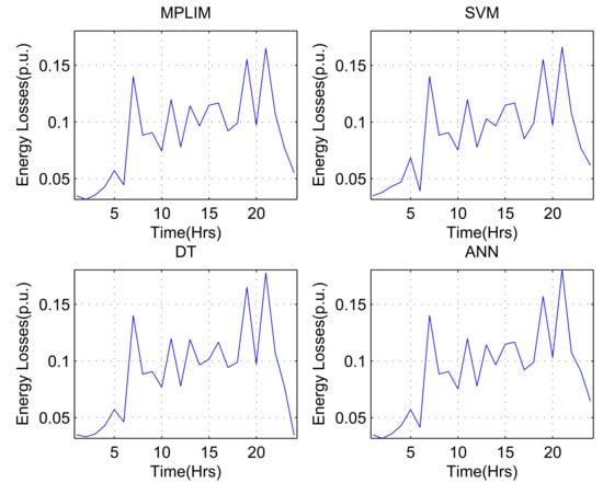 Day 2 was chosen to validate the results from this database, which is the day with the highest levels of energy losses. Table 6 shows a comparison of the hourly values of energy losses of the studied system, obtained by MPLIM and by the three ISs for the day that present higher levels of losses.