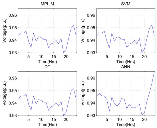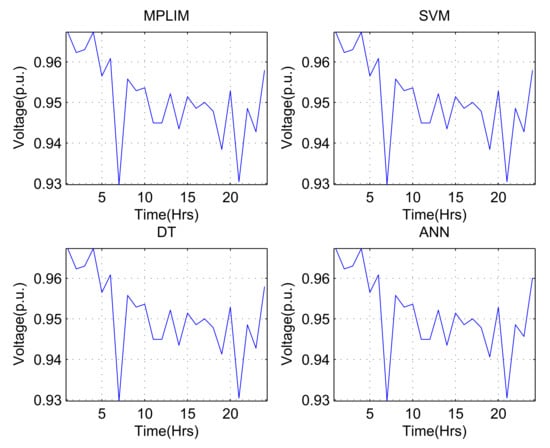 Figure 10 shows the minimum voltage in the system for each time interval (control action defined by the ISs for 24 h) for the demand variation percentage of .