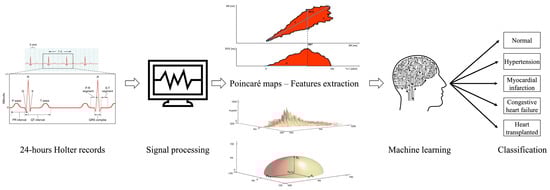 Study workflow. ECG recordings are processed to achieve Poincaré maps from which specific features are extracted. Finally, ML strategies are fed (using these features) to demonstrate that the selected algorithms are capable to suitably classify the group to which each Holter record belongs to. Attributions: 2022 electrocardiogram from Wikimedia and ecg machine by ProSymbols from the Noun Project.