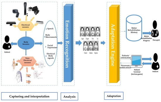 This is the most important stage. The objective of this phase is to adapt the exer-game according to the emotion transmitted by the analysis phase. It contains three parts: (i) Adaptation Engine: responsible for defining the various adaptation mechanisms as well as the various reactions that the system must perform following a change in the patient’s emotions. In the field of rehabilitation, several decisions and changes must be made in the metrics of motor rehabilitation (rehabilitation time, number of repetitions, and the difficulty of the exercise…). (ii) Motor rehabilitation history: every change will be saved in this part of the system, with the goal of following the progress of patients, preparing reports, and finally sending them to the therapists. Indeed, with this part, we can have access to various data whenever needed. (iii) Exercise or application: this part must be subscribed to the adaptation engine layer in order to make the appropriate changes in the game, to adapt to his psychological state of the patient.