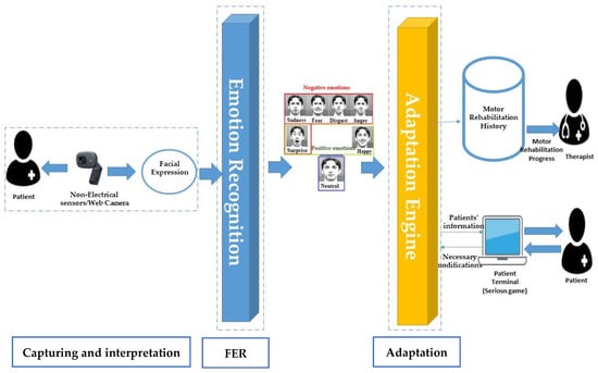 Consequently, some work was carried out on personalized games. The researchers in [26] proposed a VR framework for Parkinson’s disease rehabilitation. The proposed system is designed to capture various movements of the upper limbs, unilateral or bilateral, and the captured motion is represented one-to-one in the virtual world of the video game. The difficulty of the game can be monitored remotely by the clinician. One study [22] investigated the use of free-hand interaction using gesture tracking sensors such as leap motion to support hand rehabilitation of patients with strokes or trauma. The researchers in [17] developed a Tetris-like game for motor rehabilitation after stroke. This system uses the Oculus Rift display device with Razer Hydra Motion Controllers, where patients perform pronation/supination movements with their hands. The difficulty of the exer-game changed dynamically according to the score obtained at a given time. The Rehab Bots game was created in [24]. It is based on the virtual assistant identified by therapists and contains three main levels that are: (1) a virtual assistance robot that shows patients how to properly perform the exercises, (2) an intelligent movement notifications module that analyzes and represents patients in 3D, then, if necessary, adjusts the game to the appropriate level to achieve the best outcome, and (3) a dynamic correction module that takes into account both the level of game complexity and the virtual assistant readings in order to create a series of exercises that are more suited to the patients’ capacities. Personalized Exer-game Language (PEL) [20] was used to generate exer-games with a focus on young people [21]. Azure Kinect DK was used to analyze the movement of the entire body. One study [48] proposed an open-source framework to develop serious games using client/server architecture to facilitate the connection between different platforms. Two examples of serious games were played: the classical Gym-Tetris game and a problem-solving task game. The disadvantage of the last two strategies is that modification needs the involvement of kinesthetic rehabilitation experts. This means that the system will not be able to adapt on its own. To offer a personalized serious game for rehabilitation, [49,50] propose a recommender system, based on interaction analysis and preferences of the user. A lot of suggestions about serious adaptive games are directed at adults in general, without caring for young people in particular, as they quickly get bored of rehabilitation exercises. That is why [21] suggests a serious game adaptation for young people, where they develop serious games that support plug-and-play metaphors for natural interaction. The author in this study insists on the need to personalize the rehabilitation process for each individual. Despite the effort made in personalized exer-games development, the emphasis, however, is on the game difficulty progress, not on the patient’s states. With personalized games proposed in the literature, it is difficult to know whether the patient is in good or bad situation. Thus, patients can present situations of stress, fatigue, or anxiety without the game detecting this. Here, the exer-game leads to a negative performance. Therefore, we are interested in studying the emotions of patients in the exer-game. Some studies have been interested in using this method to adapt serious games for learning. Thus, these studies did not specifically address motor rehabilitation. For example, in [51], the authors present a fruit-slicing exer-game to help a hemiparetic person, adaptive serious game in real-time. It is based on KINECT to recognize facial expressions and adjust the game’s complexity according to the player’s emotions. The real-time adaptation is executed using Facial Action Coding System (FACS) as described in [37]. FACS is a method of describing facial movements which are used to find the emotion of the person. Another study [52], had been carried to predict the players’ emotions. However, he did not use it for adaptation, but only to assess the learner’s cognitive states during the educational video game, they used binomial logistic regression method to predict the cognitive-affective states of flow.