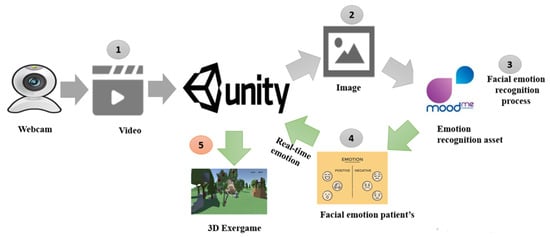 A serious game was developed using Unity 3D (Figure 3). The exer-game is developed based on the architecture proposed in advance. We have used a web camera as a sensor whose role is to track the patient’s face. The video will be used by Unity to detect real-time patient emotions based on the combination of the Mood Me [54] asset and the DeepFace framework [53]. Deepface is a framework to be used in Python, and Mood me can be used in Unity. We have extracted the neural network (weight model) from DeepFace, and then, included the model in the Mood Me asset. We based our system on this asset to preprocess the real-time photos of the patient, and to detect his face during training using the Barracuda package [55]. Then, Mood Me used the DeepFace model to predict the real-time users’ emotions. The emotion result will be the entry of the adaptation equation to decide which actions will be executed in the game.