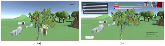 Adaptive serious game developed based on VR-PEER architecture. (a): participant’s interface, (b): interface used to test the facial emotion recognition.