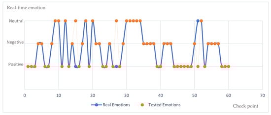 We made a 10-min test. Facial emotion recognition (FER) using the DeepFace method is done in each frame since there are 24 frames in every second, i.e., the number of emotional recognitions during this period will be 14,400. The adaptation will be executed every 10 s. As a result, we will calculate the average of the positive, negative, and neutral emotions (results represented in Figure 5). We will obtain 60 values calculated with the equation below: