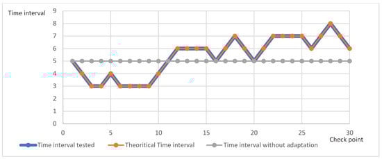 We note that the time interval changes dynamically after each execution of the adaptation process, while it remains constant if it is not applied. We also note that the values we obtain in the test are the same as those calculated manually. Thus, we conclude that the function we used for adaptation is applied correctly in the game.