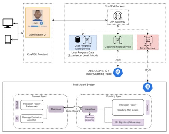 - Agent Microservice—This microservice was developed in a previous study [29] and comprised a Multi-Agent System developed in Jade [31] with the definition of two main agents that communicate with each other: A Personal Agent that returns the interaction (message queue), to be sent directly to the user, and evaluates the feedback provided by the user in terms whether the user achieved a health goal after performing a certain interaction with him/her; A Coaching Agent that applies a Reinforcement Learning strategy (using a Q-Learning algorithm) to understand which interactions should next be sent to the user at specific moments of the day based on the information exchanged with the Personal Agent and the interactions with the user. This Reinforcement Learing strategy allows the system to learn from the older person as he/she provides more feedback and understands which messages are most influential to motivate the person to achieve their health goals. Then, future interactions can be adapted according to this information.