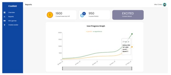 As explained in the previous section of this work, an important decision that was taken while designing the application of the proposed system was to “gamify” the solution to not only enhance the overall quality of the solution but improve the user experience, with the goal of motivating the user to stay connected to the application. A comprehensive study was carried out on the use of gamification techniques applied to elderly care [3] to understand which kind of techniques and elements are more frequently applied in this context, and which have been more successful. We concluded with a consideration of different features that will translate the current user progress within the application, such as the use of experience/level and the use of points as the system’s currency to unlock new content. All these features have already been integrated into our system, as can be seen in Figure 2.