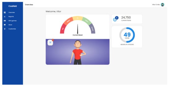 The developed application also presents a cognitive virtual assistant that holds an emotional state corresponding to the user progress, which will improve as the user improves his/her health condition and decrease as the user worsens his/her health condition (see Figure 3). To measure the current emotional state of the cognitive assistant, we evaluate all coaching plans assigned to that user in terms of the number of goals that were successfully achieved by that user and the total number of goals that needed to be achieved during that coaching plan’s execution. The details of these plans are described in more detail in our previous work, in [27]; however, the general idea is to establish different health goals for parameters that are monitored, which must be over/under/equal to a certain range or value.