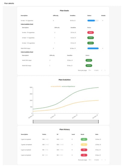The coaching plan details include information on: (1) the status of each defined goal (whether the goal has already been achieved or not) and information on the intermediate goals needed to achieve a goal (for example, in Figure 6, different goals related to smoking habits are shown with intermediate goals for the user to smoke fewer than a certain number of cigarettes per day); (2) plan evaluation with the experience and points that are accumulated as the user achieves more goals; (3) plan history in terms of all the outcomes of the plan’s execution (goals achieved, points obtained, experience gained, increase (or not) in the user level, and change in emotional state).