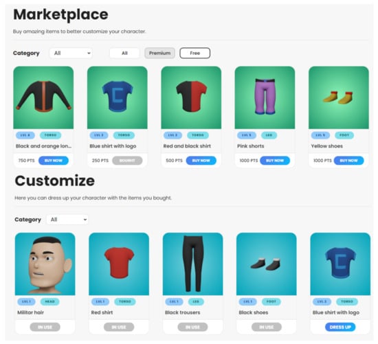 The coaching application also considers a marketplace in which the user can unlock additional content, as he is rewarded by successfully achieving positive health results. Currently, this additional content is strictly related to the customization of the cognitive assistant (see Figure 7), but other rewards could also be considered in the future (for example, content provided by family members of the elderly person such as congratulatory photos or videos).