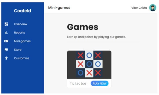 Finally, the coaching application also includes a mini-games section (see Figure 8) in which the elderly person can participate in different cognitive challenges to not only improve his/her cognitive condition, but also to earn rewards. We have designed a tic-tac-toe application with different difficulty levels. In the easier level, the user must defeat the computer and a random selection strategy is applied. In the harder level, the user must draw against the computer and a strategy using the minimax algorithm [30] is applied (computer never loses). The main reason for developing this section of the application was to define additional ways for the user to acquire points that can be exchanged for rewards, so that the user does not have to rely completely on the progress of any active coaching plans but instead can improve other aspects of his/her current health condition. This way, even if the user is struggling to achieve a certain goal (for example, the goal of improving physical conditions, such as walking a number of steps per day), he/she would still be able to make use of the application and acquire points, and consequentially increase their level, thus improving their overall player status.