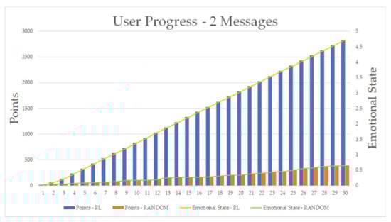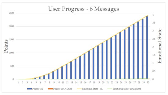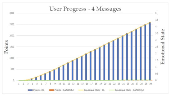 The second scenario (see Figure 10) obtained the second-best results among the three scenarios. In terms of values, the RL approach obtained an average of 2600 points and an emotional state of 4.33 (which corresponds to the excited state). On the other hand, the RANDOM approach obtained an average of 20 points and an emotional state of 0.03 (which corresponds to the sad state).