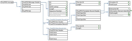 The E1 field gets a value of zero or one. In the case of one, the extended SetID field is present. In turn, the extended SetID field is absent in the case of zero. The E2 field also gets zero or one. Should the value be one, the extended sequence number field is present. Otherwise, it is absent. The field SetID lookup is set to zero in this work, as its definition is not clear in RFC 8272 [], which specifies TinyIPFIX. The length field stores the total length of the TinyIPFIX message in bytes. The total length includes the length of the TinyIPFIX message header and all the sets in the message.