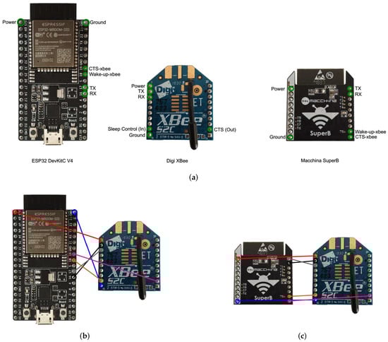 ESP32/Digi XBee Wiring. (a) Pin Overview; (b) Connecting the ESP32 DevKitC V4 with the XBee (End Device). (c) Connecting the SuperB with the XBee (End Device).