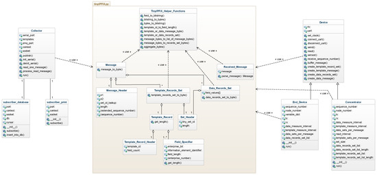 Figure 4 shows the class diagram that was developed in this work. The figure facilitates the understanding of the implementation details that follow. All classes related to the TinyIPFIX protocol implementation are gathered in the tinyIPFIX.py file on the ESP32 device. For more details on the concrete implementation, the GitHub repository [] may be consulted.