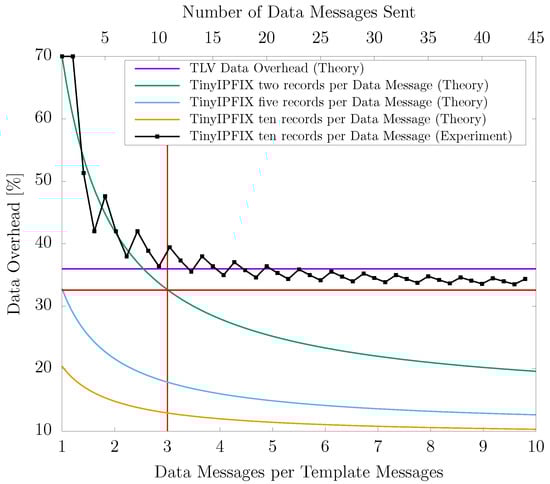 The black line represents an experiment in which only Collector and Concentrator A are activated in the network. The concentrator is configured to send its identifier (i.e., 2 bytes), a temperature readout (i.e., 4 bytes), and a timestamp (i.e., 19 bytes). The number of data messages per template message is configured at 3 (i.e., the concentrator sends three data messages per one template message), while the number of value fields is configured at two (i.e., there are two measurements gathered in a data message). It is worth noting that only data values count as the payload, while other TinyIPFIX-related fields (e.g., headers) count as the overhead. The relative data overhead of the TinyIPFIX scheme is calculated. To obtain the relative data overhead, the absolute overhead (i.e., in bytes) is divided by the size of the data payload sent. The black line displays the relative overhead as a function of data messages sent (i.e., top x-axis). As the experiment holds two field values and uses the three data messages per template message transmission scheme, a red vertical line is drawn at , according to the bottom x-axis, i.e., three data messages per template message that crosses the green line (i.e., TinyIPFIX holding two records per data message). Then, another red horizontal line is drawn, which connects the aforementioned crossing with the y-axis. This line displays the asymptotic performance of the TinyIPFIX holding two items in a data message, where three data messages are issued per template message. It is well observed that the black line reflecting a real experiment asymptotically approaches the horizontal red line when the number of data messages sent grows along the top x-axis. Furthermore, this TinyIPFIX scheme (i.e., black line) suffers an asymptotic overhead of around 33.5% overhead. Thus, it already outperforms the TLV constant overhead of 36%, i.e., by a factor of around 7%.
