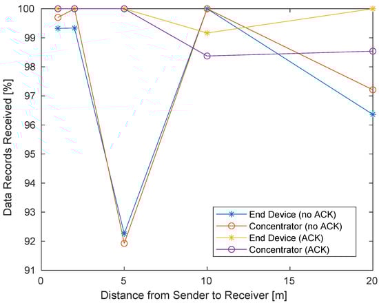 Multiple measurements were performed, where two parameters were altered between measurements. The first parameter is the distance between devices. Initially, these devices spanned a distance of 1 m, i.e., the distance between end devices and the concentrators, and the distance from the concentrators to the collector was set to 1 m. Then, further measurements were performed, where the distance between devices was set to 2, 5, 10, and 20 m. The second parameter was the MM (cf. Section 3.2.3), which controls the IEEE 802.15.4 acknowledgment. All devices in the WSN were configured to create a data record set every 10 s and send a data message as soon as two data record sets were created. Figure 6 shows the results of these measurements.