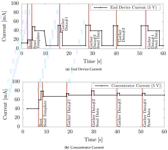 Figure 7 shows the ESP32-based end device and concentrator current. In this setup, the end device is configured to send measurements roughly every 10 s. It is visible that in the deep sleep mode (i.e., between readings), the device consumes around 35 mW, while the peaks are at 260 mW.