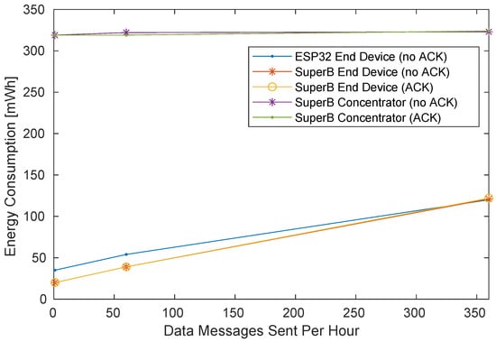 Figure 8 shows the energy consumption of different devices as a function of messages sent per hour. One can observe that sending more messages greatly increases the energy consumption for end devices, while it does not matter in the case of concentrators. This has to do with the fact that end devices are in the deep sleep mode most of the time, while concentrators are only in idle mode such that they do not lose any arriving messages. The energy consumption mainly depends on the time that devices are in the sleep or deep sleep mode. Using as a battery an alkaline battery of 4200 mWh, the SuperB device reporting one data record per hour could last for around 9 days. Thus, the implementation of TinyIPFIX in these settings is considered a success; however, the currently configured energy expenses of ESP32 devices are still high due to elevated deep sleep power consumption of 20 mWh.