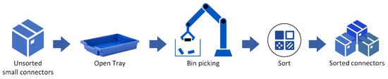 The operation takes place in a ‘Bin-Picking Station’ (see Figure 3), which consists of a collaborative robot for parts’ manipulation, one Intel RealSense camera for stereoscopic (3D) vision, one working table, two ‘Open Trays’ containing unsorted small plastic connectors and eight ‘boxes’, where the robot will put the sorted connectors.