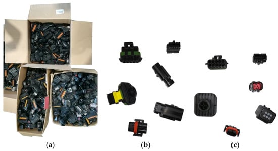 (a) Boxes of connectors for reuse. (b,c) Sample of some of the connectors used for recognition, in different poses.