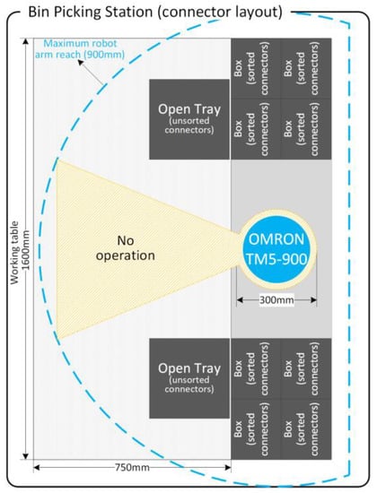 This station is responsible for grasping the connectors in the ‘Open Trays’ and sorting the connectors into the output boxes, correctly aligned to be reused in other workstations to remove seals and re-insert the connectors into the production lines. As can be seen in Figure 3, the layout has been prepared to maximize the robot’s working area and operating times. As a collaborative robot is used, it can work on one side of the station, left or right, while an operator can insert new bins and remove sorted boxes on the other side, reducing downtimes as much as possible.