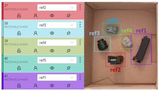 The success of object detection is strongly influenced by the labeling and training of the objects to be detected. The tasks performed in the training process for any object detection are typically composed of four stages, as depicted in Figure 4. Several images of the connectors in different poses and under different lighting conditions were acquired to cover as much of the variability as possible in the Bin-Picking Workstation. Using a labeling application, by defining regions, references were created for all connectors, as depicted in Figure 5.