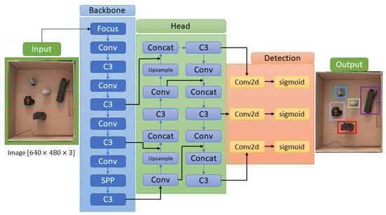 The main difference of each version is in the complexity and number of hidden layers of each deep neural network, which varies from simpler (small) to more complex (Xlarge). To choose the best version to use in each application, a trade-off analysis between speed, computational processing time and accuracy is required. Larger neural networks favor better accuracy results, but on the other hand the computational cost tends to be very slow, sometimes not valid for real-time applications. All YOLOv5 versions were tested and the YOLOv5s was selected for the final application, as it produced the best accuracy–speed–robustness relation for our use case. The YOLOv5 object detection algorithm works like a regression problem with three main components or sections, the Backbone, the Head and the Detection, as illustrated in Figure 6. The Backbone is a CNN that collects and models image resources at different granularities. The Head is a series of layers to combine image resources to throw them into a prediction process. Detection is a process that uses Head resources and performs box and class prediction steps. To do this, a loss function for bounding boxes’ predictions based on the distance information between the predicted frame and the real frame, known as Generalized Intersection over Union (GIoU), is used. This function is proposed in [26] and described by Equation (1):