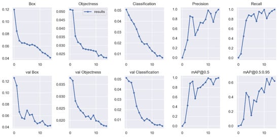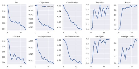 The output results for the YOLOv5s algorithm, based on the training dataset, are depicted in Figure 9. A total of 15 Epochs were used to achieve a high Precision, Recall and mean Average Precision (mAP)—additional iterations would not have led to a substantial gain. Among all the identified KPIs, these were the most relevant for our analysis, and their values were obtained using Equations (4)–(6), respectively: