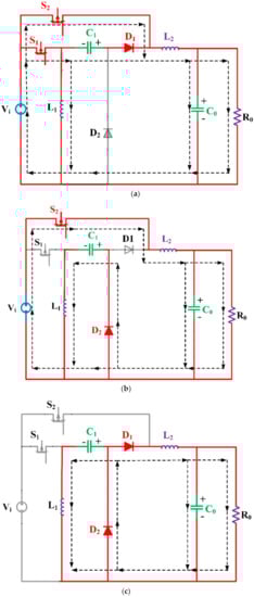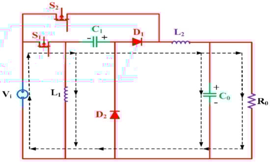 - Mode-1 (0 < t < δ1T): In this mode Switch S1 and S2 are turned ON and Vi is in parallel with inductor L1, so the voltage across inductor L1 is equal to the Vi. L1 is charged through Vi, and L2 is charged through Vi + VC1 and capacitor C1 is discharged through L2 + V0, which are illustrated in Figure 3a. As a result, the following equations can be obtained: