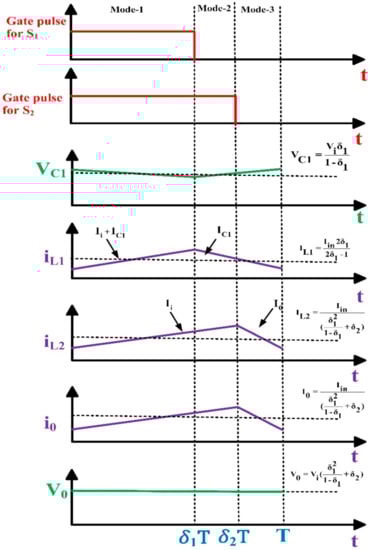 - Mode-3 (δ2T < t < T): In this mode, two switches are turned OFF. L1 is discharged through VC1, and L2 is discharged through V0, and capacitor C1 is charged through L1 as in Figure 3c. The inductor voltages can be computed as