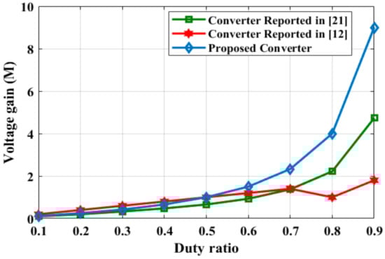 The proposed converter is comparable with the classical Zeta, KY, and the converters described in [12,19,21]. Table 1 illustrates the validation of the proposed converter’s capabilities in terms of voltage gain and component count. The proposed converter outperforms the converters reported in [12,21], and the conventional Zeta converter in terms of voltage gain. The voltage gain versus duty cycle for several buck-boost converters is illustrated in Figure 5. Furthermore, the proposed converter contains fewer components than the converters described in [18,19]. The proposed converter also provides a constant input current, making it more appropriate for applications of fuel cells and renewable energy sources.