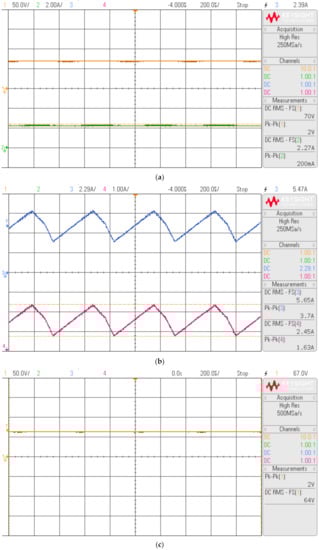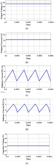 Similarly, during the time interval δ2T, inductor L2 is connected in series to the input source and the current across the inductor increases to a maximum value of 3.1 A for remaining time the inductor is connected to the load while the current across the inductor decreases linearly and reaches its minimum value of 1.8 A. The average inductor current across iL1 and iL2 are 5.7 A and 2.8 A, respectively. Figure 6c,d demonstrated that the converter works in continuous conduction mode. During the time interval δ1T, the capacitor C1 is connected in parallel to the inductor L1, so the capacitor discharges its energy and reaches its minimum value and the remaining time, the capacitor charges via inductor L1 reaching its maximum value of 65 V. Figure 6e, shows the average capacitor value of step-up mode.