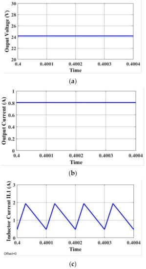 As for step-up operation mode, Figure 7 displays the simulation results of the proposed hybrid Zeta converter in step-down operation mode. The simulated output voltage of the converter in a step-down mode for the input voltage of 36 V is 22.5 V, as shown in Figure 7a. The theoretical voltage obtained from Equation (10) is 25 V for the duty cycle of 33%. Figure 7b shows the proposed hybrid converter output current with the value of 2 A. During the time interval δ1T, the inductor L1 is linked in parallel with the input source and the current across the inductor increases to the maximum value of 2 A. In the remaining time the inductor is connected in parallel to the capacitor C1 and the current across the inductor is decreases linearly and reaches its minimum value of 0.5 A.